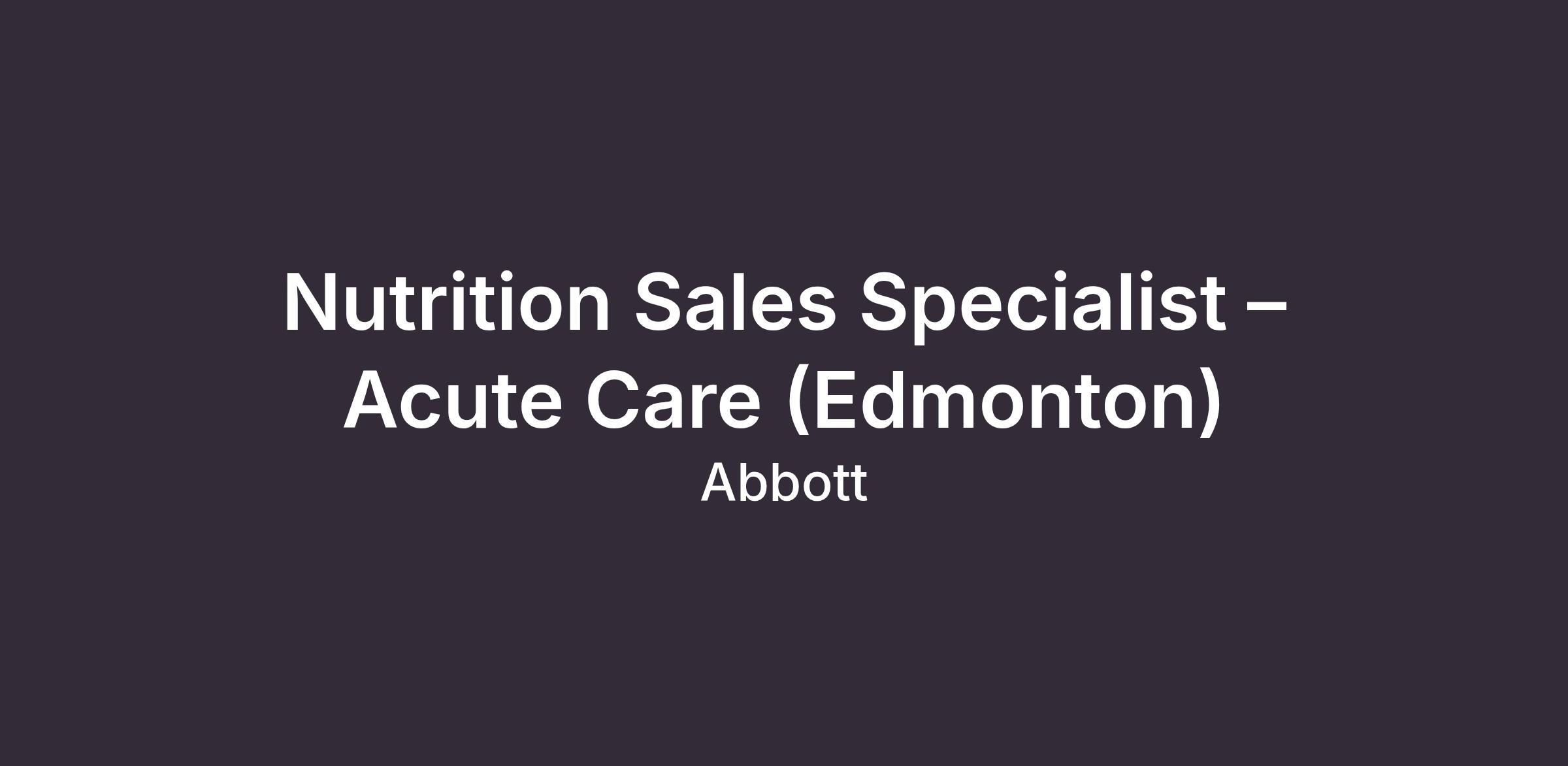 The Nutrition Sales Specialist Acute Care Representative is field based in Edmonton, Alberta. Our nutrition business develops science-based nutrition products for people of all ages, from helping babies and children grow, to keeping adult bodies strong and active. Millions of people around the world count on our leading brands – including Similac®, PediaSure®, Pedialyte®, Ensure® andGlucerna® – to help get the nutrients they need to live their healthiest life