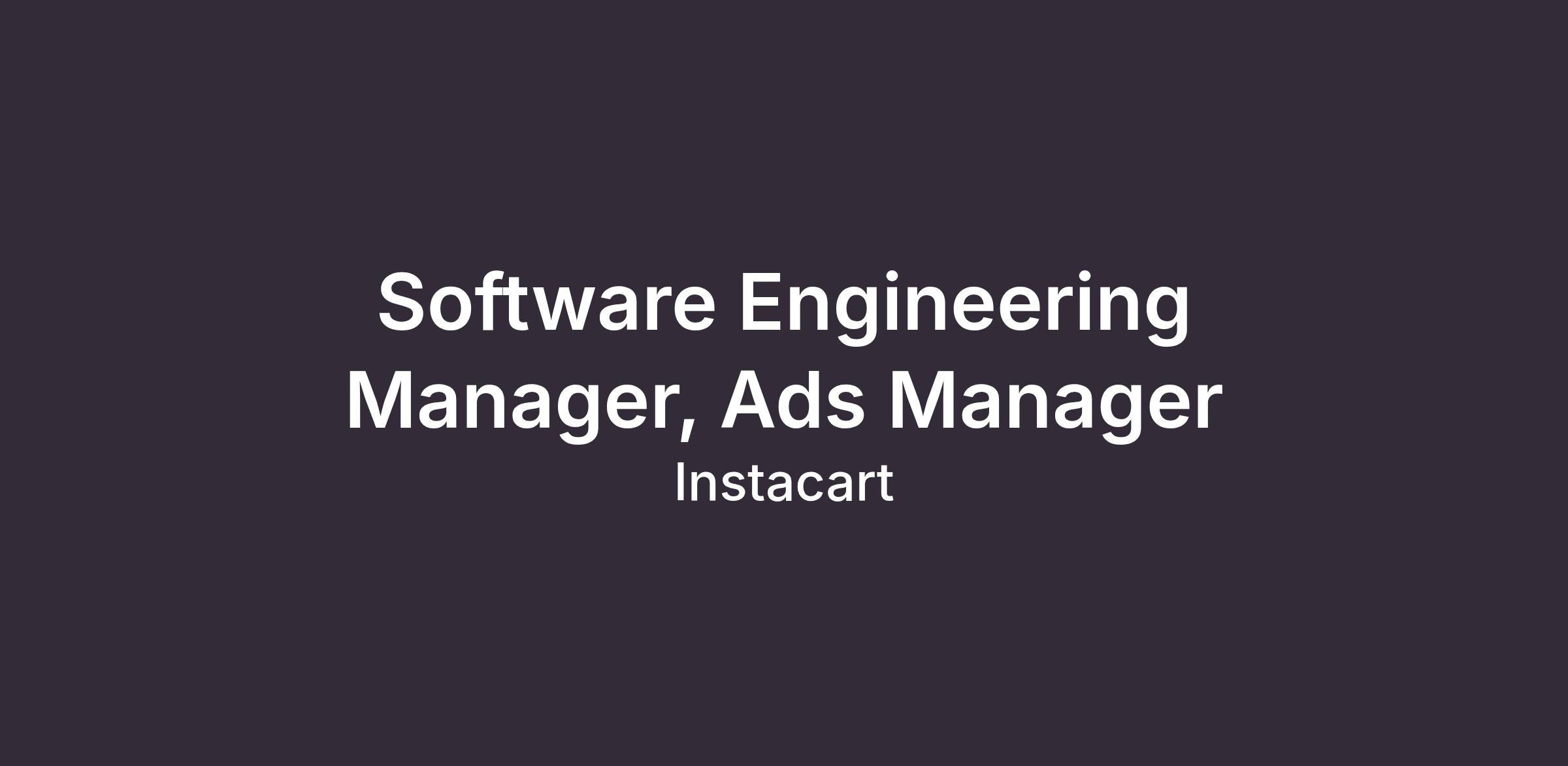 We’re looking for an Engineering Manager to lead two core Ads Manager teams—Ads Enrichment and Ads Activation—owning a broad portfolio that spans campaign management UI, optimization workflows, reporting, advertiser onboarding, brand presence tools, and new ad product experiences. You will manage two teams totaling 15 engineers, partner closely with Product and Design, and collaborate with sister engineering groups including Ads Data Pipelines, Ads Quality, and Ads Formats. This role sits at the epicenter of Ads at Instacart, with a front-row seat to most new initiatives and the opportunity to drive impact at scale.