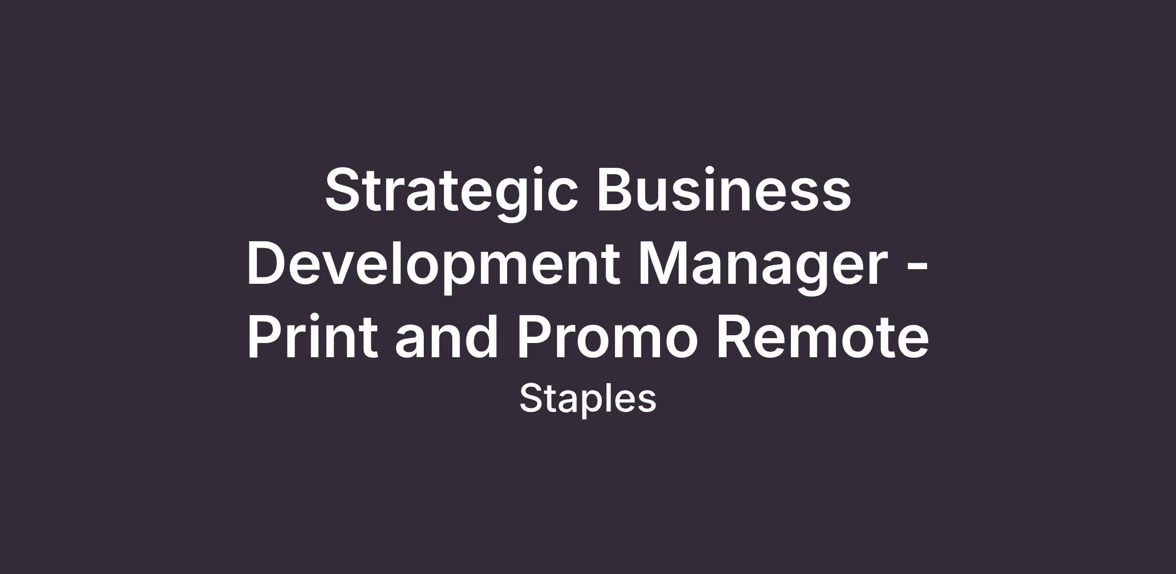 The Strategic Business Development Manager (SBDM) will directly prospect and acquire high value clients in the Enterprise & Mid-Market business space. He or she will place focus and emphasis on customers with a large spend volumes >$100K. The incumbent will secure meeting with key decision-makers, assess pain & opportunity areas in the business and present Staples’ holistic suite of print & promo services that address those key insights. The SBDM will prepare proposals, navigate legal & contractual requirements, and advance deals through to conclusion. He or she will onboard Account Managers or Strategic Account Manager who will oversee the account implementation and ongoing maintenance and stay close to the account during this period and on an ongoing basis throughout the account lifecycle.